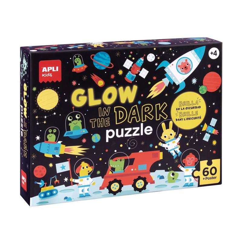 Puzle fluorescente "Glow in the dark" con temática del espacio. Incluye 60 piezas tamaño 6 x 6 cm con efecto luminiscente. Tamaño del puzle: 34 x 52 cm. Contiene un póster de tamaño real para facilitar el montaje. Una vez el puzle esté montado, los niños podrán apagar la luz para ver brillar en la oscuridad todo un mundo de cohetes, alienígenas, satelites, vehículos espaciales, planetas, cometas, etc. Diseño exclusivo infantil, colorido, claro y simple. Fácil manejo para los más pequeños: piezas resistentes, seguras y fáciles de manejar. Cartón de 2 mm de grosor con acabado mate e indiana en el dorso. Recomendado para niños a partir de 4 años. Utilizar bajo la supervisión de un adulto.