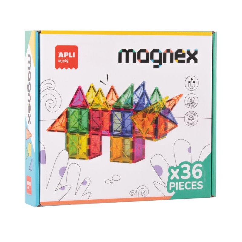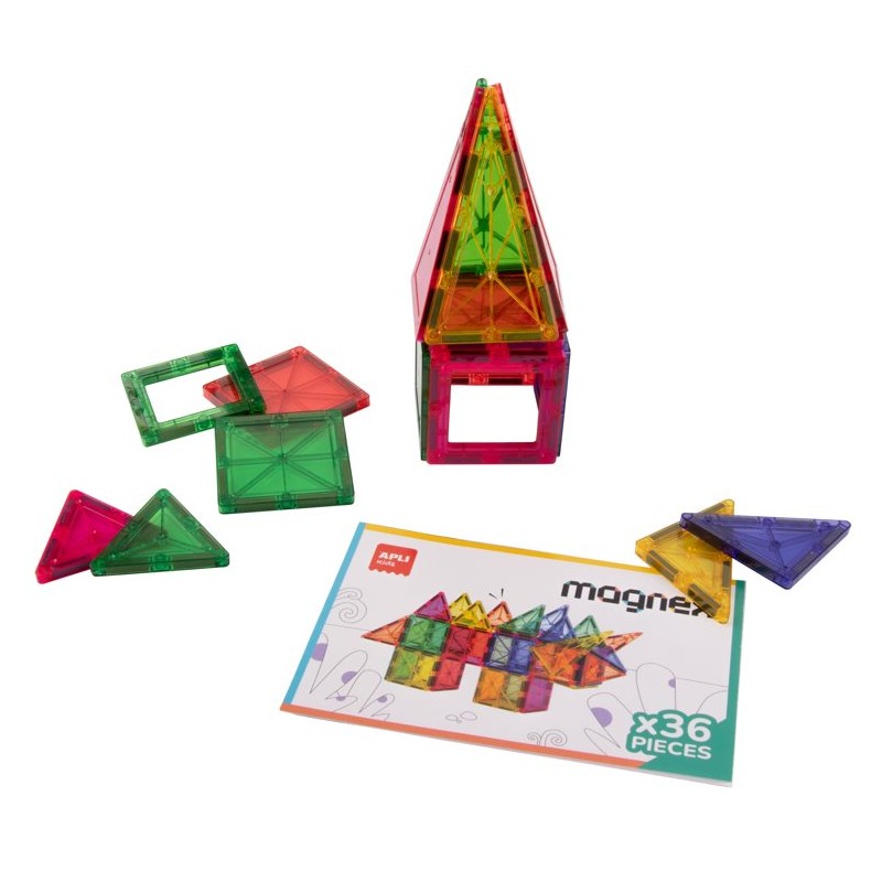 Set Magnex de 36 piezas para construir formas variadas y desarrollar la imaginación de forma libre. Las piezas magnéticas geométricas se combinan poniéndo las piezas imantadas una encima de la otra, para crear estructuras que estimulen el pensamiento espacial, la lógica y la creatividad. El juego contiene 36 piezas magnéticas y unas instrucciones con ejemplos a seguir. Es una herramienta perfecta para fomentar el aprendizaje activo desde casa o en el aula, vinculada a metodologías educativas como el enfoque STEAM. Ideal para potenciar habilidades de construcción, diseño y resolución de retos de forma divertida. Recomendado para niños a partir de 3 años.