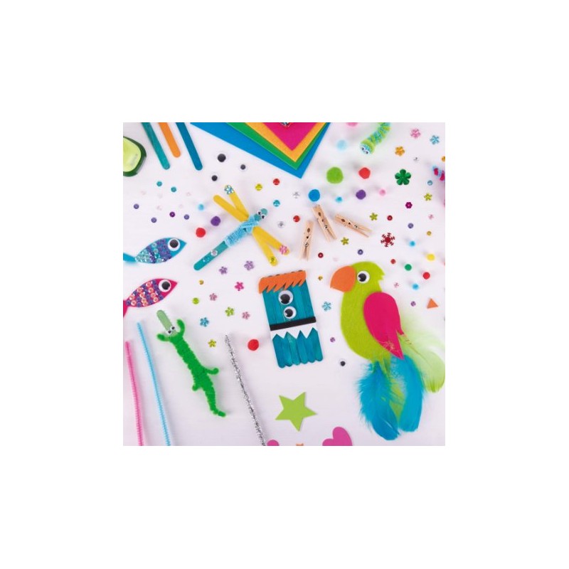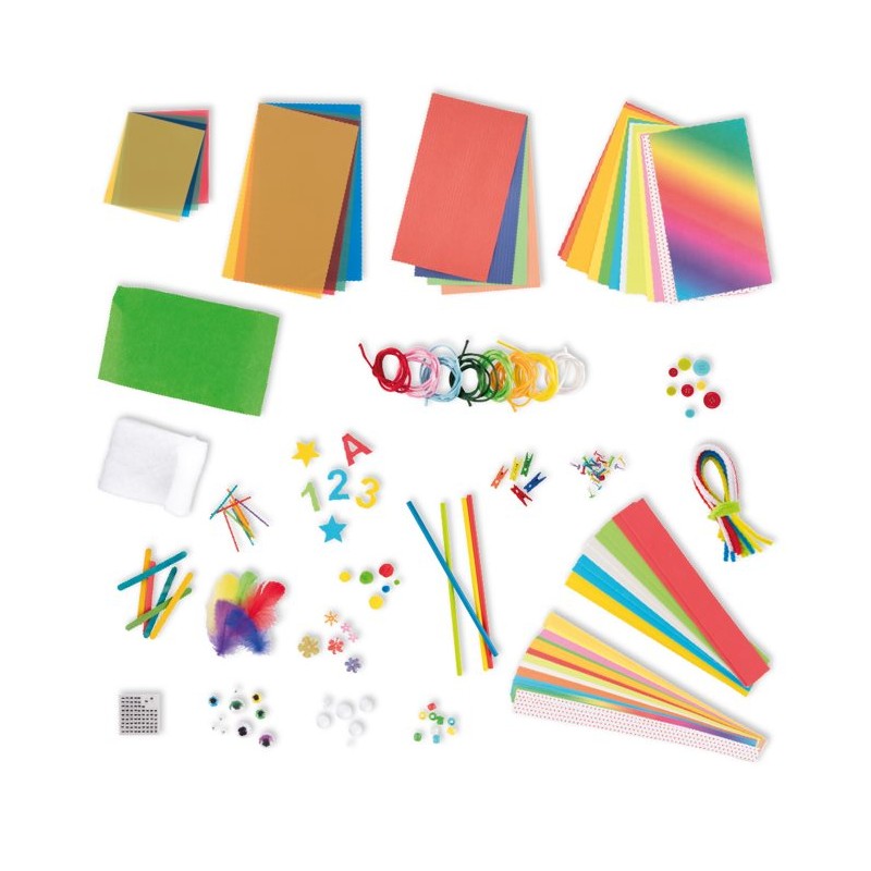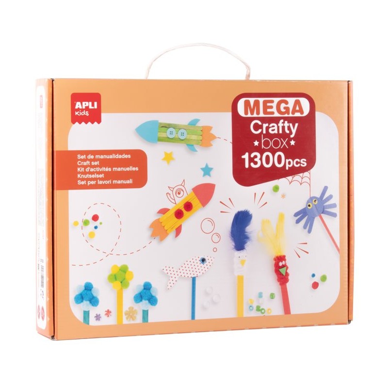 Pack escolar para hacer manualidades con 1300 piezas surtidas, presentado en caja de cartón con asa de 385x65x295 mm que contiene: 100 pompones, 280 formas de goma EVA, 100 lentejuelas con formas, 20 palos de madera, 100 ojos móviles, 5 plumas, 25 limpiapipas, 5 pinzas de madera, 10 tiras de goma EVA, 26 hojas de papel, 4 hojas de plástico M, 4 hojas de plástico S, 1 hoja de fieltro, 1 algodón, 127 tiras de papel, 30 botones, 100 cuentas de colores, 8 cintas, 20 tachuelas, 60 bolitas de porexpan, 204 palitos pequeños, 81 piedras brillantes adhesivas, 4 pajitas. Incluye libro de actividades. Recomentado a partir de 4 años.