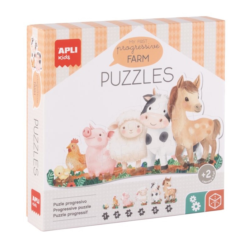 Puzle My First Farm con temática animales de la granja, un puzle progresivo diseñado especialmente para niños a partir de 2 años. Ideal como primer puzle infantil, este juego educativo ayuda a los más pequeños a desarrollar habilidades clave mientras se divierten. Incluye 21 piezas grandes y resistentes para construir 6 puzles progresivos que, al completarse, forman un puzle final de 61 x 33 cm. Los niños podrán montar simpáticos animales de granja como el pollito, la gallina, el cerdito, la oveja, la vaca y el caballo. Gracias a su diseño ergonómico y acabados seguros, este puzle es perfecto para que los más pequeños lo manipulen de forma fácil y segura. Beneficios del Puzle My First Farm: favorece el desarrollo de la psicomotricidad fina; estimula la concentración y la coordinación mano-ojo; introduce el juego progresivo de manera didáctica; familiariza al niño con los animales de la granja; fomenta el aprendizaje temprano a través del juego. Un juego educativo ideal para acompañar el crecimiento y desarrollo infantil. Perfecto como primer puzle o regalo para niños pequeños. Recomendado a partir de 2 años.