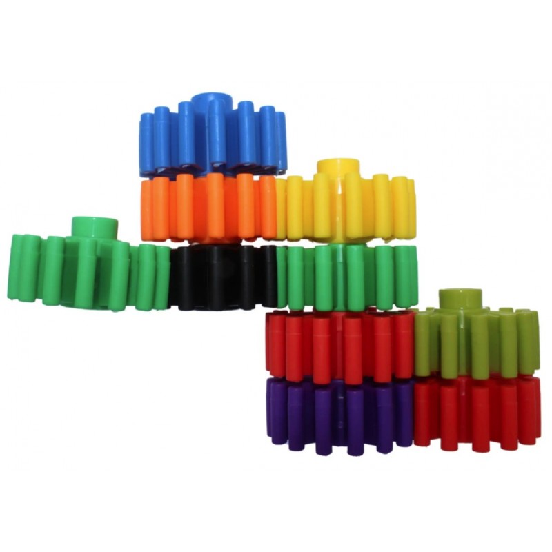Una forma divertida de descubrir los engranajes en acción. Estos bloques en forma de engranaje combinan construcción y aprendizaje STEM. Los niños pueden apilarlos, conectarlos y hacerlos girar, observando cómo se transmite el movimiento. Favorecen la motricidad fina, la creatividad y el pensamiento lógico. Lote de 500 gramos. Fabricados en plastico de gran resistencia y en diferentes colores para diferenciar, contar y clasificar. A partir de 3 años.