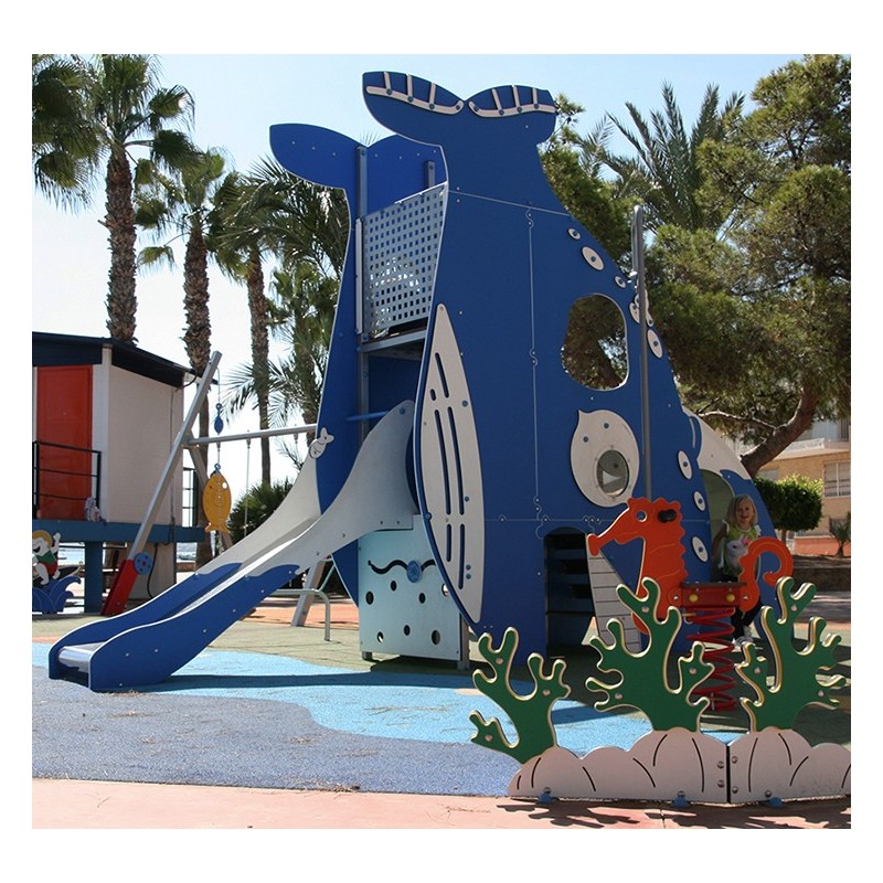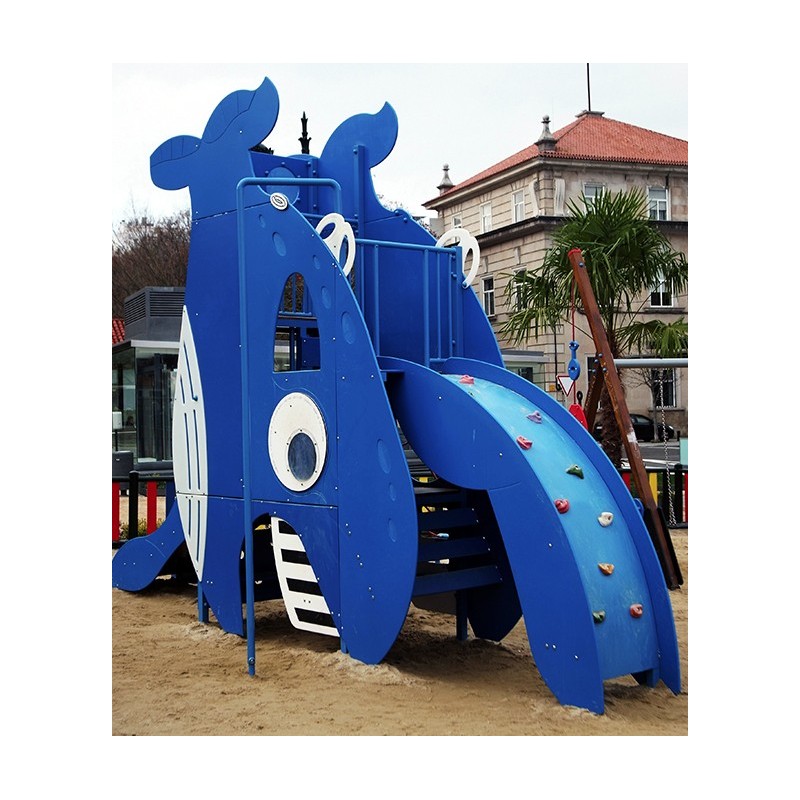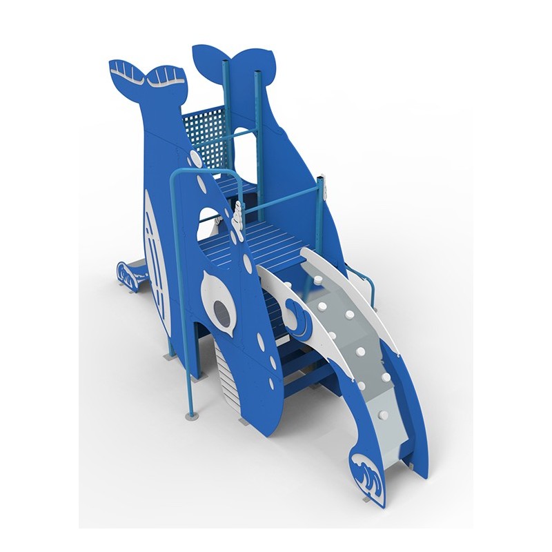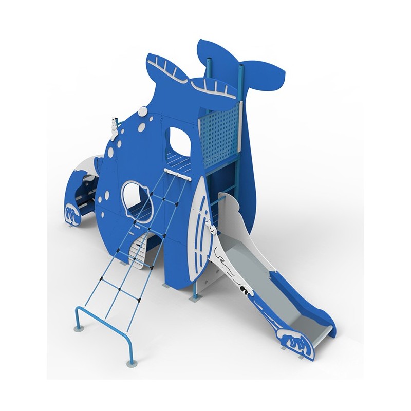 Juego infantil compacto con forma de ballena, formado por tres plataformas a distinta altura con un tobogán, una barra de bomberos, un banco, un panel lúdico, una rampa de escalada, una red trepa y aperturas para la escalada como accesos. Los usuarios disfrutarán jugando, trepando, escalando, deslizándose y realizando multitud de actividades que fomentarán el desarrollo sensorial psicomotriz así como habilidades sociales. Consultar condiciones de transporte y montaje.