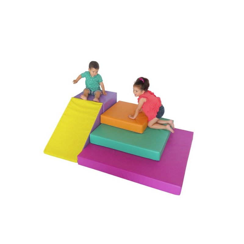 Conjunto fabricado por 5 piezas de espuma de alta densidad de 25 kgs m3 y forradas en PVC poliéster de alta calidad, hidrofobo, ignífugo m2, antialérgenos, antibacteriano, de fácil limpieza y en diferentes colores para formar conjuntos y formas multinivel para desarrollo de la psicomotricidad infantil.